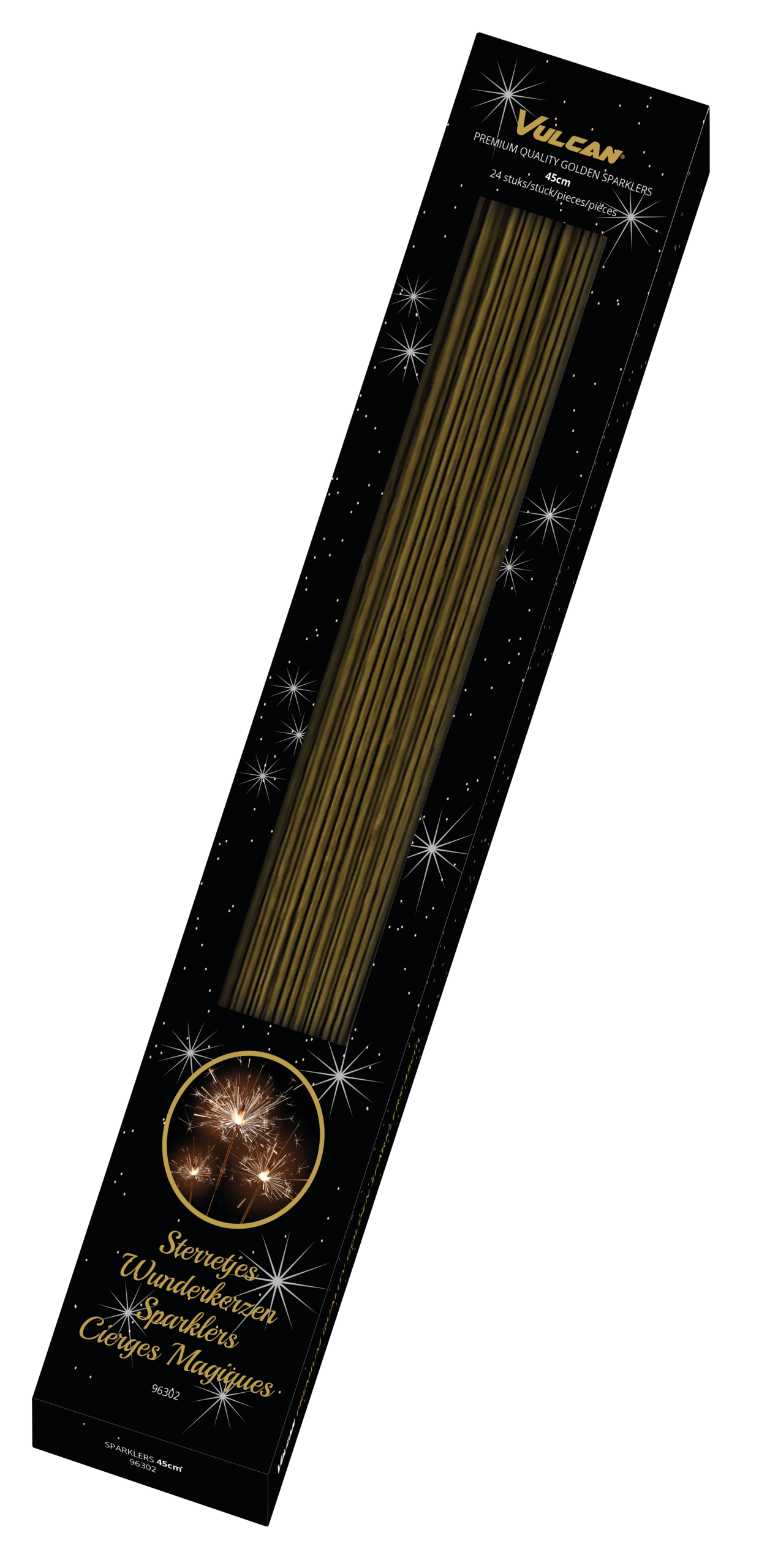 Retail Boxes of 36 Sparklers, with a beautiful Golden look and a luxury Black and Gold Presentation Box.. 24 Boxes per Outer Carton